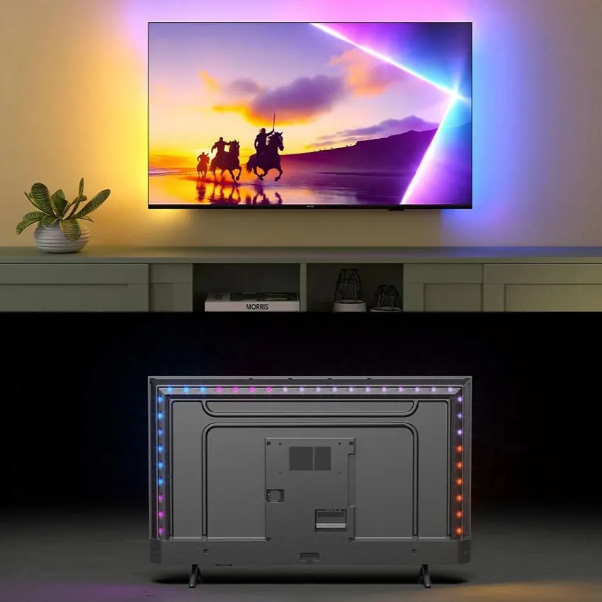 Le téléviseur LED PHILIPS 55PUS8550/12 impressionne par son généreux écran de 55 pouces et sa technologie Ambilight innovante . Le rétroéclairage sur trois côtés projette des effets lumineux colorés sur le mur derrière le téléviseur, s'adaptant dynamiquement à l'image affichée. Ceci crée une ambiance particulièrement immersive pour regarder la télévision ou du contenu en streaming. La résolution 4K Ultra HD de 3 840 x 2 160 pixels garantit des images d'une netteté et d'une précision exceptionnelles. Grâce à Titan OS, vous accédez à de nombreuses fonctionnalités Smart TV et à des services de streaming tels qu'Amazon Prime Video, DAZN, Deezer, Disney+ et Joyn. Avec son élégant design noir mat, le téléviseur s'intègre harmonieusement à tous les styles d'intérieur.